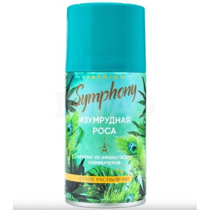 Создайте дома неповторимую атмосферу с интерьерным освежителем воздуха Symphony Premium Изумрудная роса. Разработанный лучшими парижскими парфюмерами, аромат росы, играющей в лучах утреннего солнца на листьях дерева бергамота и переливающийся аккордами экзотического цитруса и влажного ветивера, вдохновит на свежие идеи. Ионы серебра, в составе средства, нейтрализуют неприятные запахи, а эфирные масла раскрывают аккорды парфюмерного аромата.nСовершенное сухое распыление, без брызг и капель, не оставит пятен и потеков на кафеле, зеркале, текстиле, волосах и одежде.